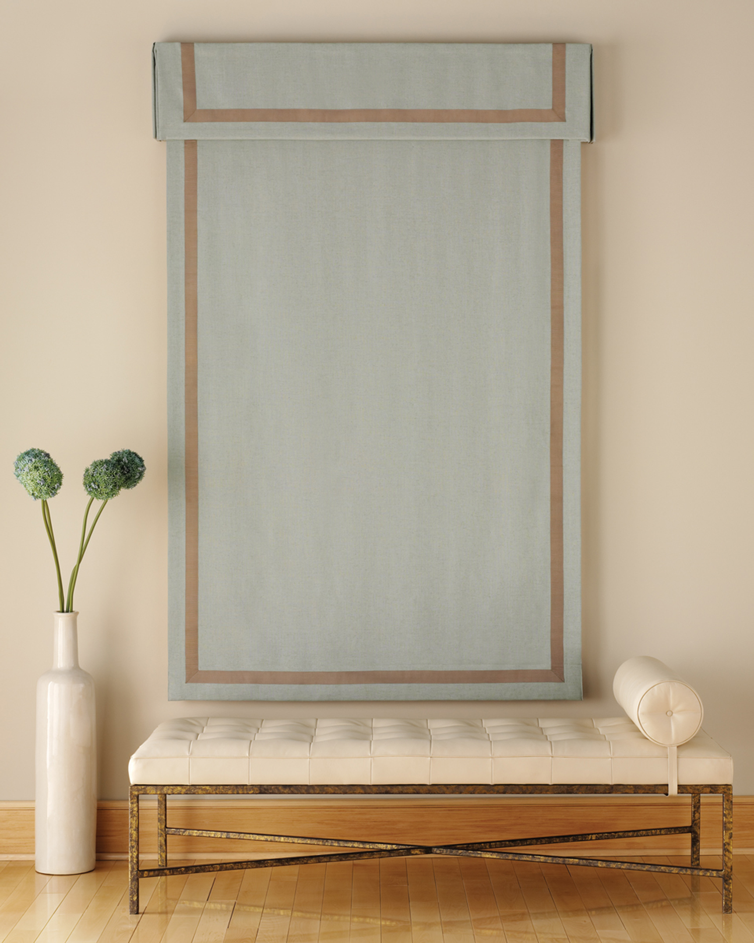 Design Studio™ Roman shades come in a wide variety of timeless fabrics like cotton, silk and linen. Available in four distinct styles. Customize even further with tapes, trims and complementary valances.