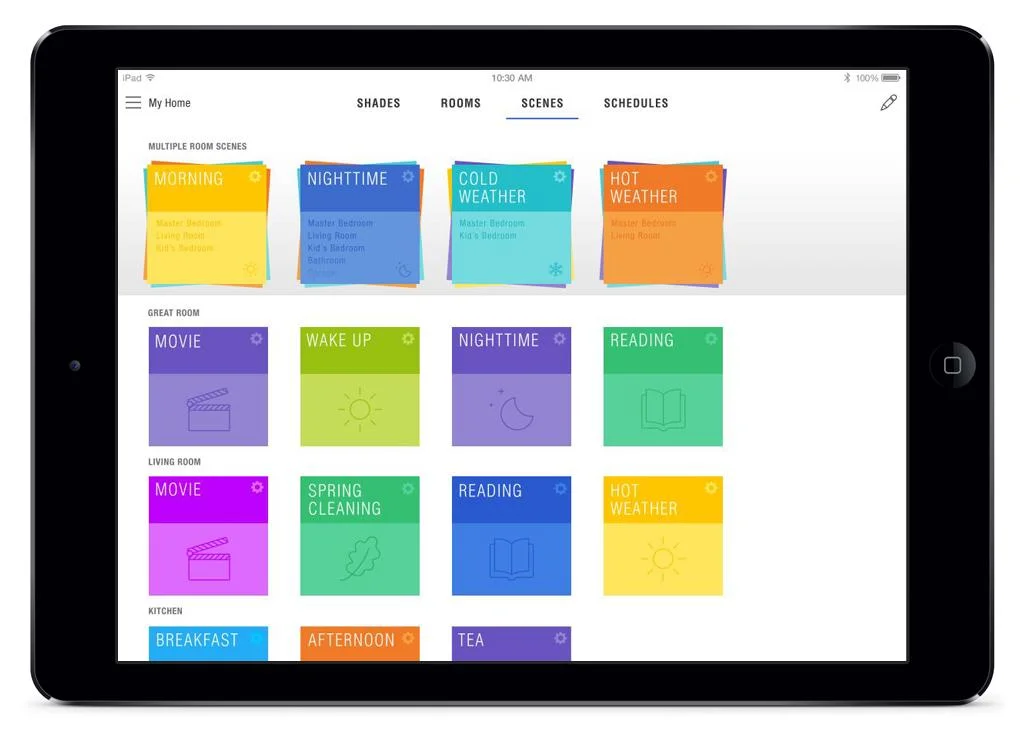 The PowerView App unlocks the full potential of PowerView Motorization. Using the App on your smartphone or tablet, you can create and schedule customized room Scenes that allow your shades to operate on their own throughout the day.